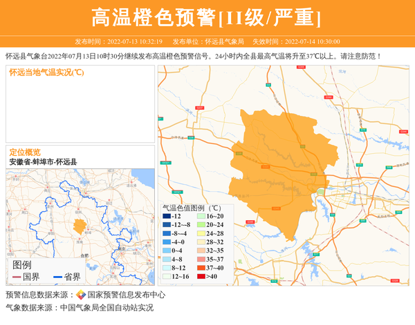 怀远县气象台2022年07月13日10时30分继续发布高温橙色预警信号。24小时内全县最高气温将升至37℃以上。请注意防范! 信息来源:国家预警信息发布中心; 发布单位:怀远县气象局。