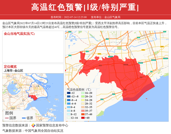 金山区气象局2022年07月14日12时25分发布高温红色预警[Ⅰ级/特别严重]:受西太平洋副热带高压影响,目前本区气温正快速上升,预计本区大部街镇今天的最高气温将超过40℃,高温橙色预警信号更新为高温红色预警信号。 信息来源:国家预警信息发布中心; 发布单位:金山区气象局。