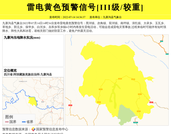 九寨沟县气象台2022年07月14日14时36分发布雷电黄色预警信号:黑河镇、勿角镇、双河镇、南坪镇、漳扎镇、大录乡、玉瓦乡、草地乡、郭元乡、保华乡、白河乡、永和乡等乡镇6小时内将发生雷电活动,可能会造成雷电灾害事故,过程来临时可能伴有短时强降水、阵性大风和冰雹,请相关部门做好防雷工作,避免户外露天活动。 信息来源:国家预警信息发布中心; 发布单位:九寨沟县气象台。