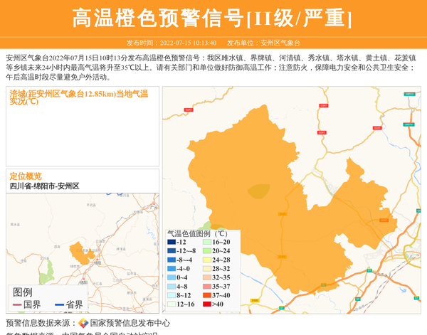 安州区气象台2022年07月15日10时13分发布高温橙色预警信号:我区雎水镇、界牌镇、河清镇、秀水镇、塔水镇、黄土镇、花荄镇等乡镇未来24小时内最高气温将升至35℃以上。请有关部门和单位做好防御高温工作;注意防火,保障电力安全和公共卫生安全;午后高温时段尽量避免户外活动。 信息来源:国家预警信息发布中心; 发布单位:安州区气象台。