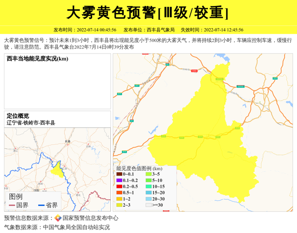大雾黄色预警信号:预计未来1到3小时,西丰县将出现能见度小于500米的大雾天气,并将持续2到3小时,车辆应控制车速,缓慢行驶,请注意防范。西丰县气象台2022年7月14日0时39分发布 信息来源:国家预警信息发布中心; 发布单位:西丰县气象局。
