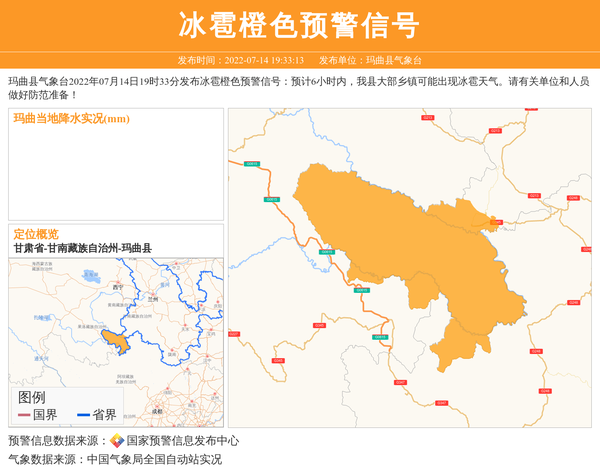 玛曲县气象台2022年07月14日19时33分发布冰雹橙色预警信号:预计6小时内,我县大部乡镇可能出现冰雹天气。请有关单位和人员做好防范准备! 信息来源:国家预警信息发布中心; 发布单位:玛曲县气象台。