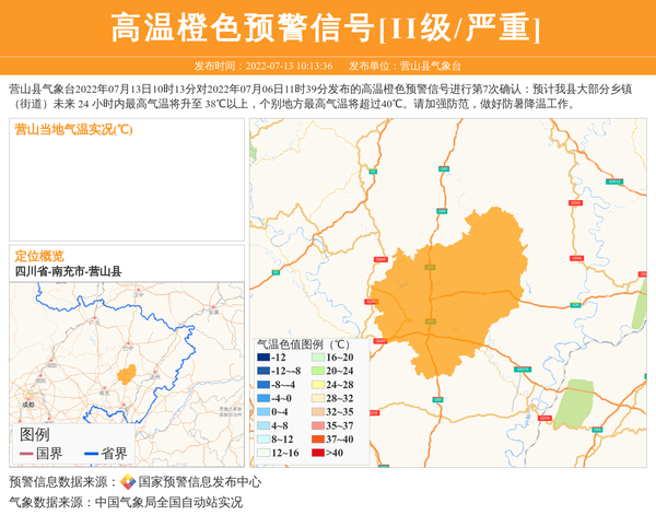 营山县气象台2022年07月13日10时13分对2022年07月06日11时39分发布的高温橙色预警信号进行第7次确认:预计我县大部分乡镇(街道)未来 24 小时内最高气温将升至 38℃以上,个别地方最高气温将超过40℃。请加强防范,做好防暑降温工作。 信息来源:国家预警信息发布中心; 发布单位:营山县气象台。