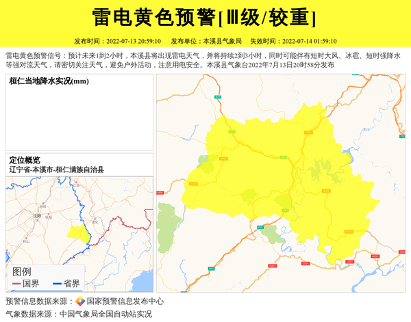 雷电黄色预警信号:预计未来1到2小时,本溪县将出现雷电天气,并将持续2到3小时,同时可能伴有短时大风、冰雹、短时强降水等强对流天气,请密切关注天气,避免户外活动,注意用电安全。本溪县气象台2022年7月13日20时58分发布 信息来源:国家预警信息发布中心; 发布单位:本溪县气象局。