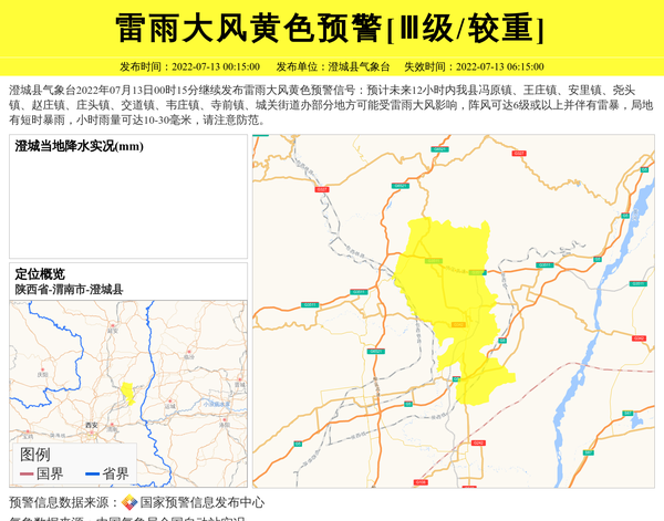 澄城县气象台2022年07月13日00时15分继续发布雷雨大风黄色预警信号:预计未来12小时内我县冯原镇、王庄镇、安里镇、尧头镇、赵庄镇、庄头镇、交道镇、韦庄镇、寺前镇、城关街道办部分地方可能受雷雨大风影响,阵风可达6级或以上并伴有雷暴,局地有短时暴雨,小时雨量可达10-30毫米,请注意防范。 信息来源:国家预警信息发布中心; 发布单位:澄城县气象台。