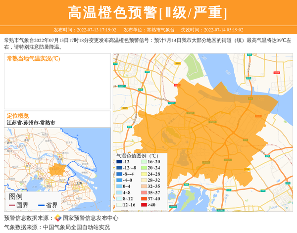 常熟市气象台2022年07月13日17时18分变更发布高温橙色预警信号:预计7月14日我市大部分地区的街道(镇)最高气温将达39℃左右,请特别注意防暑降温。 信息来源:国家预警信息发布中心; 发布单位:常熟市气象台。