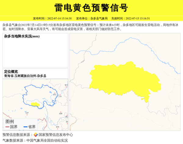杂多县气象台2022年7月14日15时15分发布杂多地区雷电黄色预警信号:预计未来6小时,杂多地区可能发生雷电活动,局地伴有冰雹、短时强降水、雷暴大风等天气,有可能会造成雷电灾害,请相关部门做好防范工作。 信息来源:国家预警信息发布中心; 发布单位:杂多县气象局。