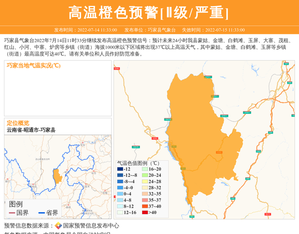 巧家县气象台2022年7月14日11时33分继续发布高温橙色预警信号:预计未来24小时我县蒙姑、金塘、白鹤滩、玉屏、大寨、茂租、红山、小河、中寨、炉房等乡镇(街道)海拔1000米以下区域将出现37℃以上高温天气,其中蒙姑、金塘、白鹤滩、玉屏等乡镇(街道)最高温度可达40℃。请有关单位和人员作好防范准备。 信息来源:国家预警信息发布中心; 发布单位:巧家县气象台。