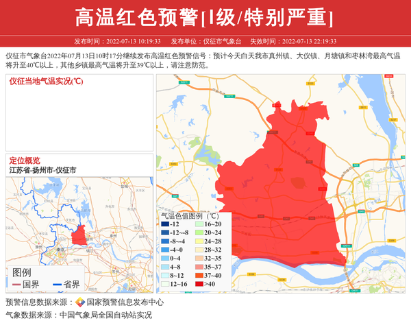 仪征市气象台2022年07月13日10时17分继续发布高温红色预警信号:预计今天白天我市真州镇、大仪镇、月塘镇和枣林湾最高气温将升至40℃以上,其他乡镇最高气温将升至39℃以上,请注意防范。 信息来源:国家预警信息发布中心; 发布单位:仪征市气象台。