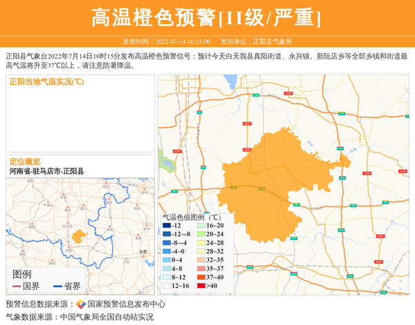 正阳县气象台2022年7月14日10时15分发布高温橙色预警信号:预计今天白天我县真阳街道、永兴镇、新阮店乡等全部乡镇和街道最高气温将升至37℃以上,请注意防暑降温。 信息来源:国家预警信息发布中心; 发布单位:正阳县气象局。