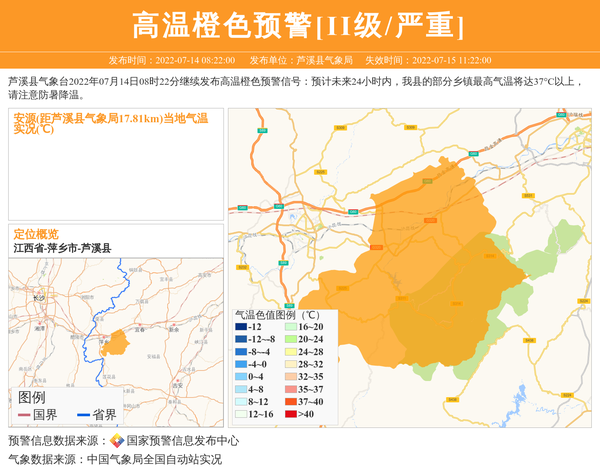 芦溪县气象台2022年07月14日08时22分继续发布高温橙色预警信号:预计未来24小时内,我县的部分乡镇最高气温将达37°C以上,请注意防暑降温。 信息来源:国家预警信息发布中心; 发布单位:芦溪县气象局。