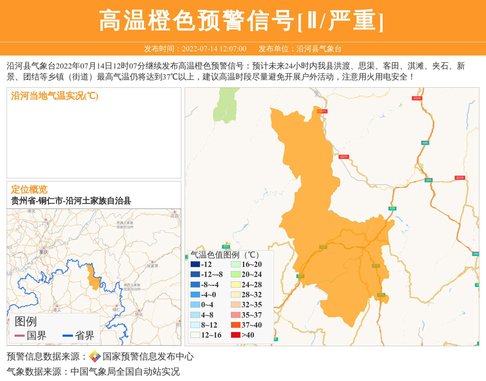 沿河县气象台继续发布高温橙色预警信号[Ⅱ/严重] 相关文章