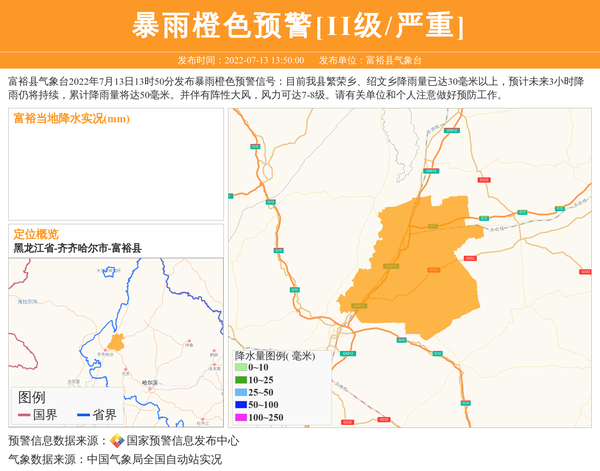 富裕县气象台2022年7月13日13时50分发布暴雨橙色预警信号:目前我县繁荣乡、绍文乡降雨量已达30毫米以上,预计未来3小时降雨仍将持续,累计降雨量将达50毫米。并伴有阵性大风,风力可达7-8级。请有关单位和个人注意做好预防工作。 信息来源:国家预警信息发布中心; 发布单位:富裕县气象台。