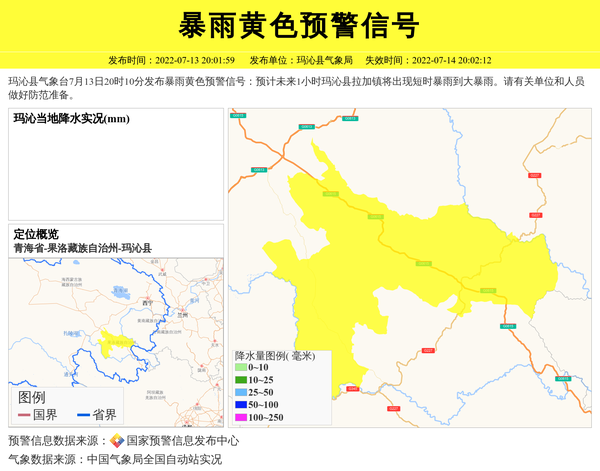 玛沁县气象台7月13日20时10分发布暴雨黄色预警信号:预计未来1小时玛沁县拉加镇将出现短时暴雨到大暴雨。请有关单位和人员做好防范准备。 信息来源:国家预警信息发布中心; 发布单位:玛沁县气象局。