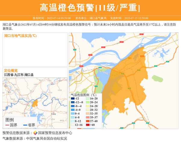 湖口县气象台2022年07月14日09时59分继续发布高温橙色预警信号:预计未来24小时内我县日最高气温将升至37℃以上,请注意防暑降温。 信息来源:国家预警信息发布中心; 发布单位:湖口县气象局。