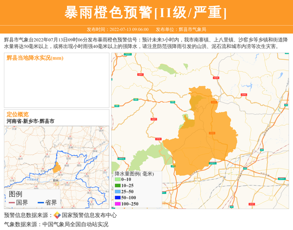 辉县市气象台2022年07月13日09时06分发布暴雨橙色预警信号:预计未来3小时内,我市南寨镇、上八里镇、沙窑乡等乡镇和街道降水量将达50毫米以上,或将出现小时雨强40毫米以上的强降水,请注意防范强降雨引发的山洪、泥石流和城市内涝等次生灾害。 信息来源:国家预警信息发布中心; 发布单位:辉县市气象局。