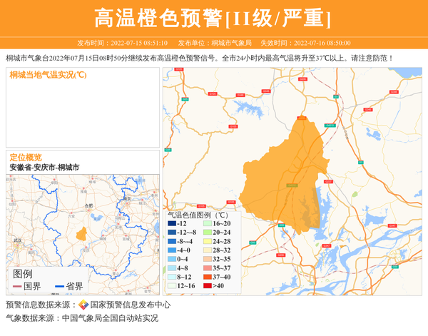 桐城市气象台2022年07月15日08时50分继续发布高温橙色预警信号。全市24小时内最高气温将升至37℃以上。请注意防范! 信息来源:国家预警信息发布中心; 发布单位:桐城市气象局。