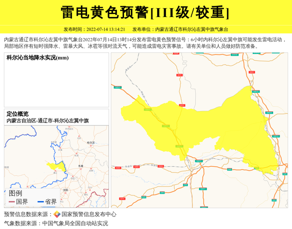 内蒙古通辽市科尔沁左翼中旗气象台2022年07月14日13时14分发布雷电黄色预警信号:6小时内科尔沁左翼中旗可能发生雷电活动,局部地区伴有短时强降水、雷暴大风、冰雹等强对流天气,可能造成雷电灾害事故。请有关单位和人员做好防范准备。 信息来源:国家预警信息发布中心; 发布单位:内蒙古通辽市科尔沁左翼中旗气象台。