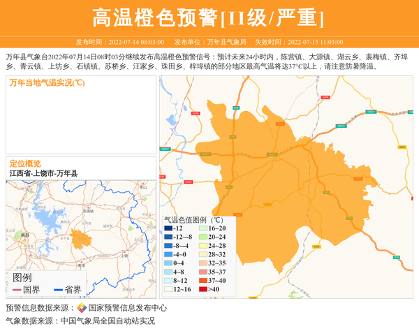 万年县气象台2022年07月14日08时03分继续发布高温橙色预警信号:预计未来24小时内,陈营镇、大源镇、湖云乡、裴梅镇、齐埠乡、青云镇、上坊乡、石镇镇、苏桥乡、汪家乡、珠田乡、梓埠镇的部分地区最高气温将达37°C以上,请注意防暑降温。 信息来源:国家预警信息发布中心; 发布单位:万年县气象局。