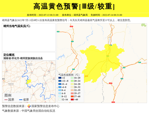 靖州县气象台2022年7月13日8时31分发布高温黄色预警信号:今天白天靖州县最高气温将升至35℃以上,请注意防范。 信息来源:国家预警信息发布中心; 发布单位:靖州县气象局。