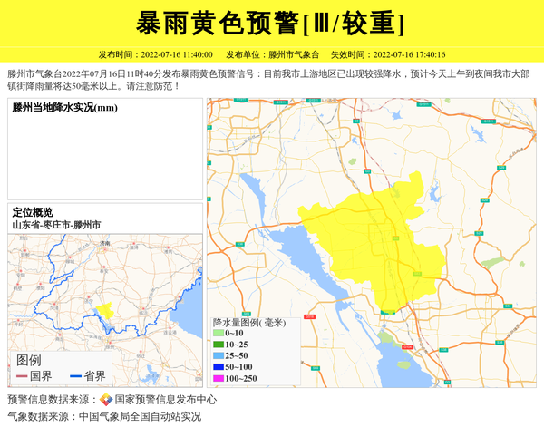 滕州市气象台2022年07月16日11时40分发布暴雨黄色预警信号:目前我市上游地区已出现较强降水,预计今天上午到夜间我市大部镇街降雨量将达50毫米以上。请注意防范! 信息来源:国家预警信息发布中心; 发布单位:滕州市气象台。