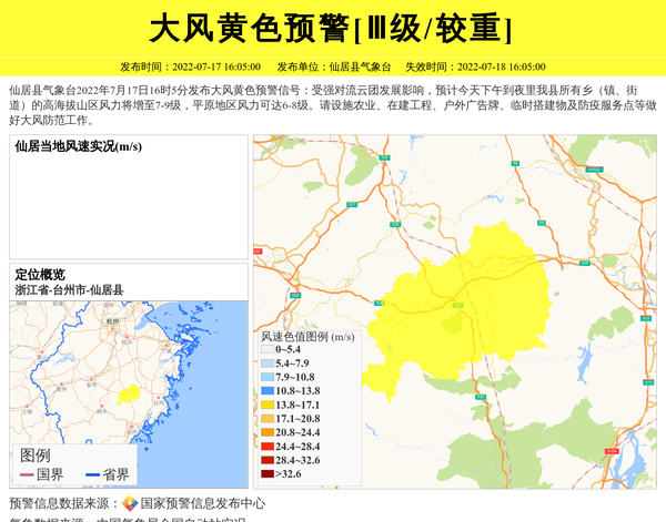仙居县气象台2022年7月17日16时5分发布大风黄色预警信号:受强对流云团发展影响,预计今天下午到夜里我县所有乡(镇、街道)的高海拔山区风力将增至7-9级,平原地区风力可达6-8级。请设施农业、在建工程、户外广告牌、临时搭建物及防疫服务点等做好大风防范工作。 信息来源:国家预警信息发布中心; 发布单位:仙居县气象台。