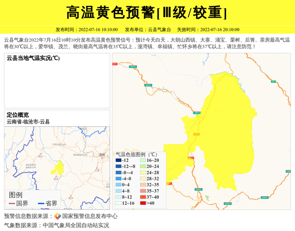 云县气象台2022年7月16日10时10分发布高温黄色预警信号:预计今天白天,大朝山西镇、大寨、涌宝、栗树、后箐、茶房最高气温将在30℃以上,爱华镇、茂兰、晓街最高气温将在35℃以上,漫湾镇、幸福镇、忙怀乡将在37℃以上,请注意防范! 信息来源:国家预警信息发布中心; 发布单位:云县气象台。