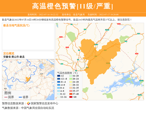 歙县气象台2022年07月16日10时20分继续发布高温橙色预警信号。歙县24小时内最高气温将升至37℃以上。请注意防范! 信息来源:国家预警信息发布中心; 发布单位:歙县气象局。