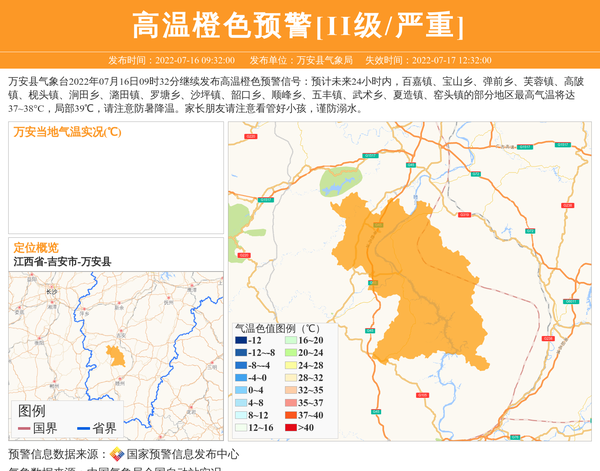 万安县气象台2022年07月16日09时32分继续发布高温橙色预警信号:预计未来24小时内,百嘉镇、宝山乡、弹前乡、芙蓉镇、高陂镇、枧头镇、涧田乡、潞田镇、罗塘乡、沙坪镇、韶口乡、顺峰乡、五丰镇、武术乡、夏造镇、窑头镇的部分地区最高气温将达37~38°C,局部39℃,请注意防暑降温。家长朋友请注意看管好小孩,谨防溺水。 信息来源:国家预警信息发布中心; 发布单位:万安县气象局。