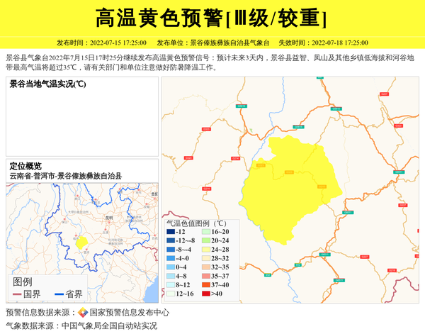 景谷县气象台2022年7月15日17时25分继续发布高温黄色预警信号:预计未来3天内,景谷县益智、凤山及其他乡镇低海拔和河谷地带最高气温将超过35℃,请有关部门和单位注意做好防暑降温工作。 信息来源:国家预警信息发布中心; 发布单位:景谷傣族彝族自治县气象台。