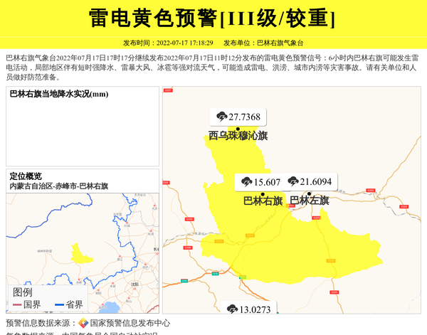 巴林右旗气象台2022年07月17日17时17分继续发布2022年07月17日11时12分发布的雷电黄色预警信号:6小时内巴林右旗可能发生雷电活动,局部地区伴有短时强降水、雷暴大风、冰雹等强对流天气,可能造成雷电、洪涝、城市内涝等灾害事故。请有关单位和人员做好防范准备。 信息来源:国家预警信息发布中心; 发布单位:巴林右旗气象台。