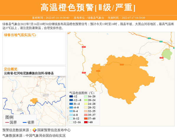 绿春县气象台2022年7月16日10时30分继续发布高温橙色预警信号:预计今天13时至18时,我县半坡、大黑山河谷地区,最高气温将达37℃以上,请注意防暑降温,合理安排作息。 信息来源:国家预警信息发布中心; 发布单位:绿春县气象台。