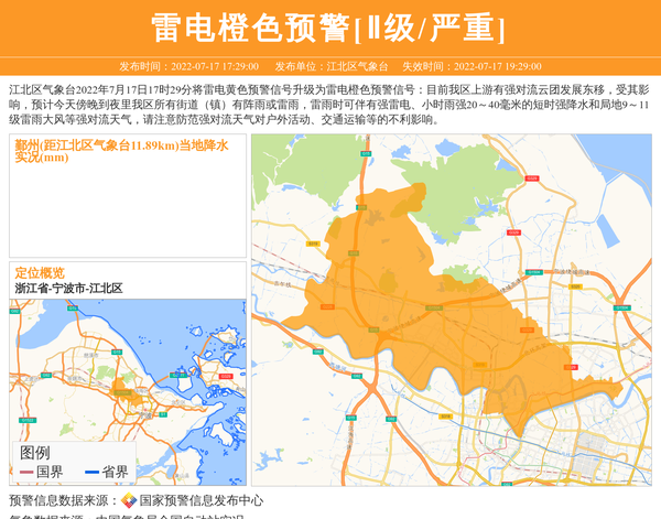 江北区气象台更新雷电橙色预警[Ⅱ级/严重]