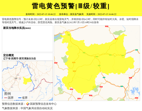 雷电黄色预警信号:预计未来1到2小时,新宾县将出现雷电天气,并将持续3到4小时,同时可能伴有短时大风、冰雹、短时强降水等强对流天气,请减少户外活动,防范雷击风险。新宾县气象台2022年7月15日10时39分发布 信息来源:国家预警信息发布中心; 发布单位:新宾县气象局。