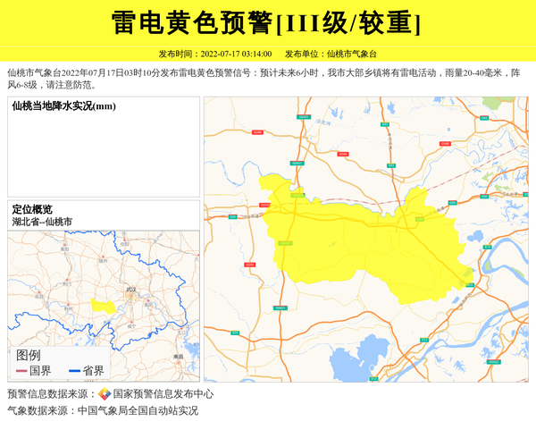 仙桃市气象台2022年07月17日03时10分发布雷电黄色预警信号:预计未来6小时,我市大部乡镇将有雷电活动,雨量20-40毫米,阵风6-8级,请注意防范。 信息来源:国家预警信息发布中心; 发布单位:仙桃市气象台。