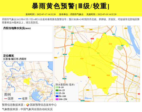 丹阳市气象台2022年07月17日14时33分发布暴雨黄色预警信号:预计未来6小时我市丹北镇、界牌镇、开发区、司徒镇等北部地区降雨量将达50毫米以上,请注意防范。 信息来源:国家预警信息发布中心; 发布单位:丹阳市气象台。