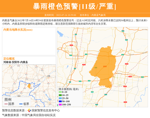 内黄县气象台2022年7月16日10时59分更新发布暴雨橙色预警信号:过去3小时后河镇、六村乡降水量已达到50毫米以上,预计未来3小时内,内黄县所辖乡镇和街道降雨还将持续,请注意防范强降雨引发的城市内涝等次生灾害。 信息来源:国家预警信息发布中心; 发布单位:内黄县气象局。