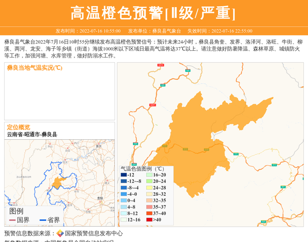 彝良县气象台2022年7月16日10时55分继续发布高温橙色预警信号:预计未来24小时,彝良县角奎、发界、洛泽河、洛旺、牛街、柳溪、两河、龙安、海子等乡镇(街道)海拔1000米以下区域日最高气温将达37℃以上。请注意做好防暑降温、森林草原、城镇防火等工作,加强河塘、水库管理,做好防溺水工作。 信息来源:国家预警信息发布中心; 发布单位:彝良县气象台。