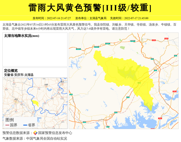 太湖县气象台2022年07月16日21时45分发布雷雨大风黄色预警信号。我县弥陀镇、刘畈乡、天华镇、寺前镇、汤泉乡、牛镇镇、百里镇、北中镇等乡镇未来6小时内将出现雷雨大风天气,风力达7-8级并伴有雷电。请注意防范! 信息来源:国家预警信息发布中心; 发布单位:太湖县气象局。