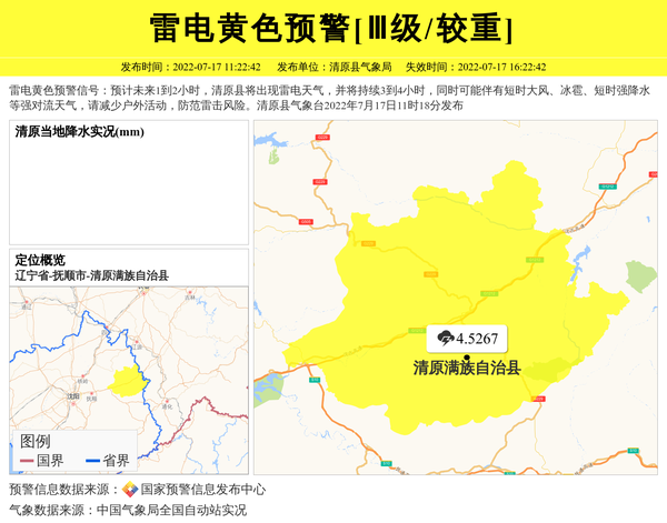 雷电黄色预警信号:预计未来1到2小时,清原县将出现雷电天气,并将持续3到4小时,同时可能伴有短时大风、冰雹、短时强降水等强对流天气,请减少户外活动,防范雷击风险。清原县气象台2022年7月17日11时18分发布 信息来源:国家预警信息发布中心; 发布单位:清原县气象局。