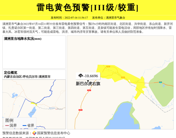 满洲里市气象台2022年07月16日11时55分发布雷电黄色预警信号:预计6小时内南区街道、北区街道、兴华街道、东山街道、新开河镇、扎赉诺尔区第一街道、第二街道、第三街道、第四街道、第五街道、灵泉镇可能发生雷电活动,局部地区伴有短时强降水、雷暴大风、冰雹等强对流天气,可能造成雷电、洪涝、城市内涝等灾害事故。请有关单位和人员做好防范准备。 信息来源:国家预警信息发布中心; 发布单位:满洲里市气象台。