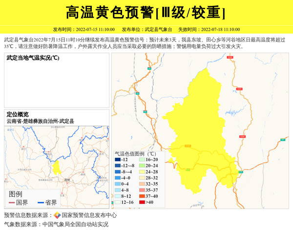 武定县气象台2022年7月15日11时10分继续发布高温黄色预警信号:预计未来3天,我县东坡、田心乡等河谷地区日最高温度将超过35℃,请注意做好防暑降温工作,户外露天作业人员应当采取必要的防晒措施;警惕用电量负荷过大引发火灾。 信息来源:国家预警信息发布中心; 发布单位:武定县气象台。