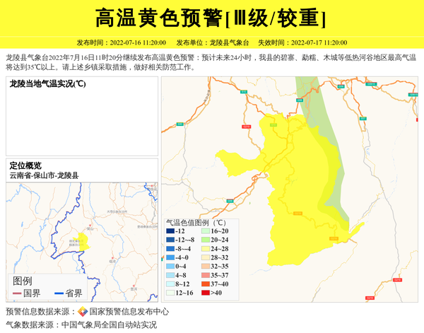 龙陵县气象台2022年7月16日11时20分继续发布高温黄色预警:预计未来24小时,我县的碧寨、勐糯、木城等低热河谷地区最高气温将达到35℃以上。请上述乡镇采取措施,做好相关防范工作。 信息来源:国家预警信息发布中心; 发布单位:龙陵县气象台。