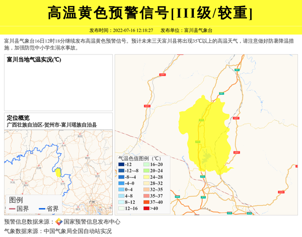 富川县气象台16日12时18分继续发布高温黄色预警信号。预计未来三天富川县将出现35℃以上的高温天气,请注意做好防暑降温措施,加强防范中小学生溺水事故。 信息来源:国家预警信息发布中心; 发布单位:富川县气象台。
