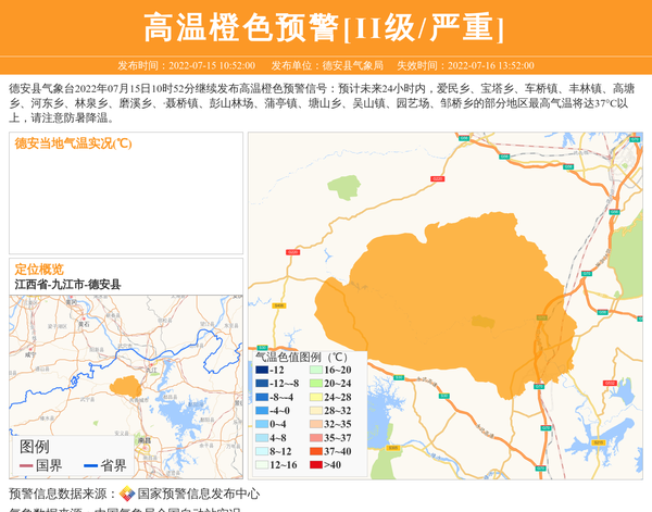 德安县气象台2022年07月15日10时52分继续发布高温橙色预警信号:预计未来24小时内,爱民乡、宝塔乡、车桥镇、丰林镇、高塘乡、河东乡、林泉乡、磨溪乡、·聂桥镇、彭山林场、蒲亭镇、塘山乡、吴山镇、园艺场、邹桥乡的部分地区最高气温将达37°C以上,请注意防暑降温。 信息来源:国家预警信息发布中心; 发布单位:德安县气象局。