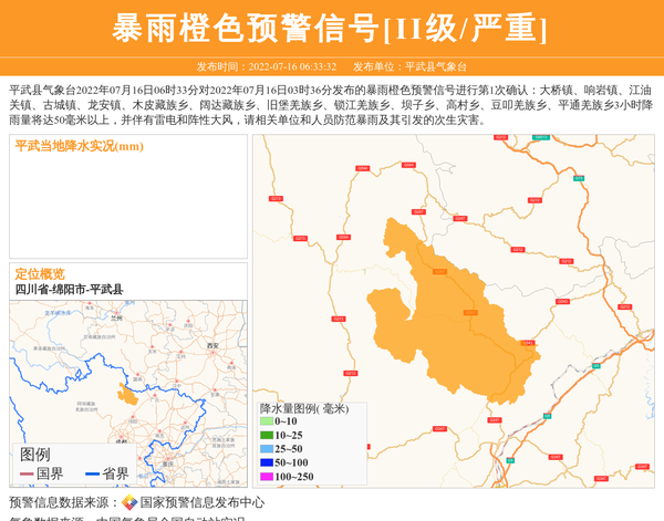 平武县气象台2022年07月16日06时33分对2022年07月16日03时36分发布的暴雨橙色预警信号进行第1次确认:大桥镇、响岩镇、江油关镇、古城镇、龙安镇、木皮藏族乡、阔达藏族乡、旧堡羌族乡、锁江羌族乡、坝子乡、高村乡、豆叩羌族乡、平通羌族乡3小时降雨量将达50毫米以上,并伴有雷电和阵性大风,请相关单位和人员防范暴雨及其引发的次生灾害。 信息来源:国家预警信息发布中心; 发布单位:平武县气象台。