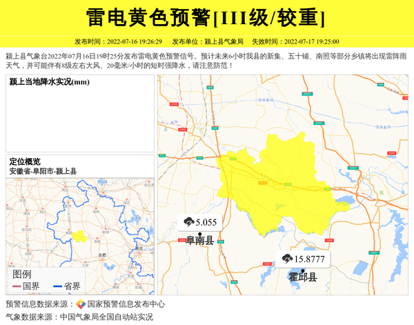 颍上县气象台2022年07月16日19时25分发布雷电黄色预警信号。预计未来6小时我县的新集、五十铺、南照等部分乡镇将出现雷阵雨天气,并可能伴有8级左右大风、20毫米/小时的短时强降水,请注意防范! 信息来源:国家预警信息发布中心; 发布单位:颍上县气象局。