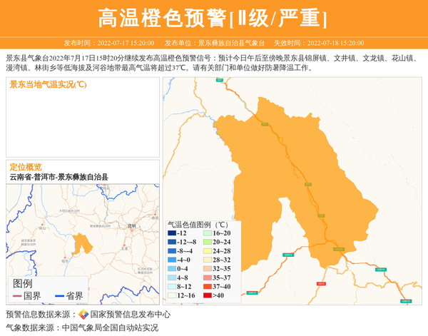 景东县气象台2022年7月17日15时20分继续发布高温橙色预警信号:预计今日午后至傍晚景东县锦屏镇、文井镇、文龙镇、花山镇、漫湾镇、林街乡等低海拔及河谷地带最高气温将超过37℃。请有关部门和单位做好防暑降温工作。 信息来源:国家预警信息发布中心; 发布单位:景东彝族自治县气象台。