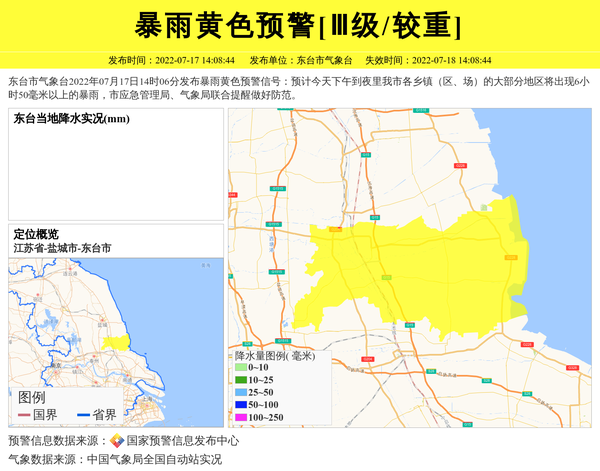 东台市气象台2022年07月17日14时06分发布暴雨黄色预警信号:预计今天下午到夜里我市各乡镇(区、场)的大部分地区将出现6小时50毫米以上的暴雨,市应急管理局、气象局联合提醒做好防范。 信息来源:国家预警信息发布中心; 发布单位:东台市气象台。