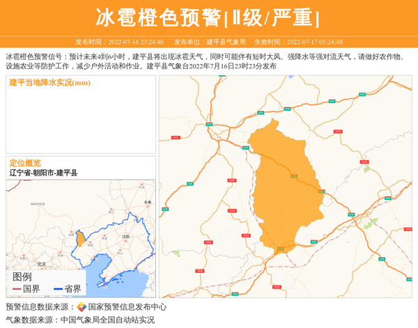 冰雹橙色预警信号:预计未来4到6小时,建平县将出现冰雹天气,同时可能伴有短时大风、强降水等强对流天气,请做好农作物、设施农业等防护工作,减少户外活动和作业。建平县气象台2022年7月16日23时23分发布 信息来源:国家预警信息发布中心; 发布单位:建平县气象局。